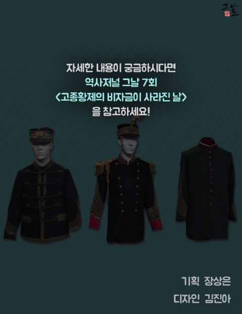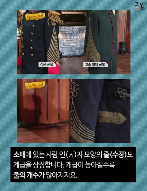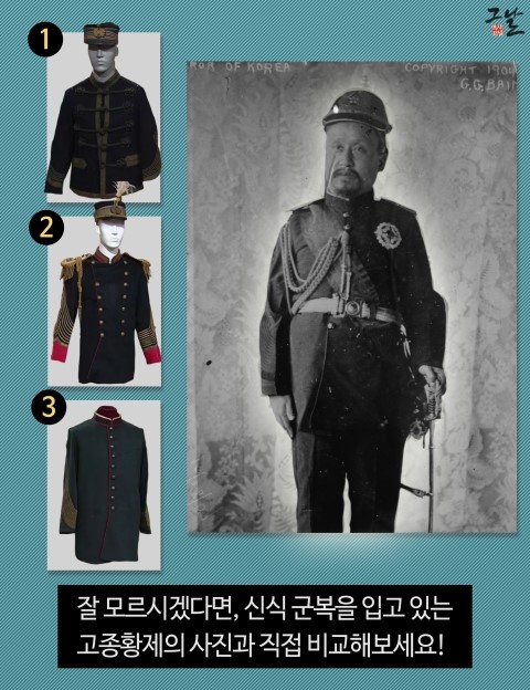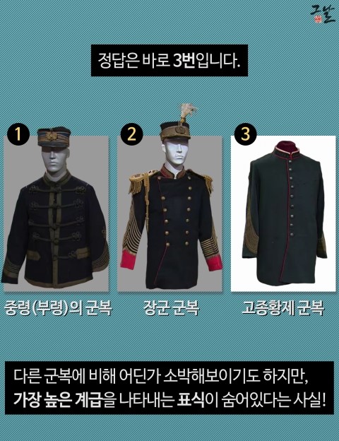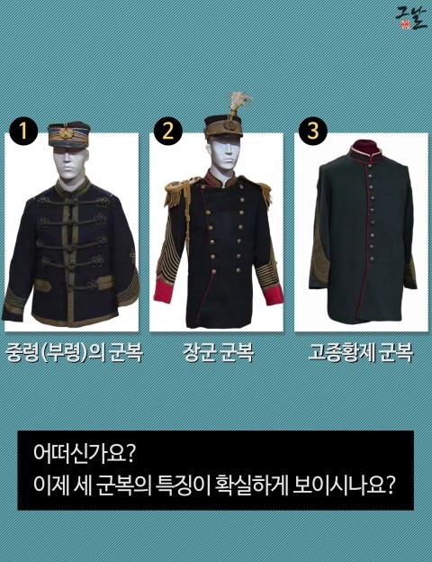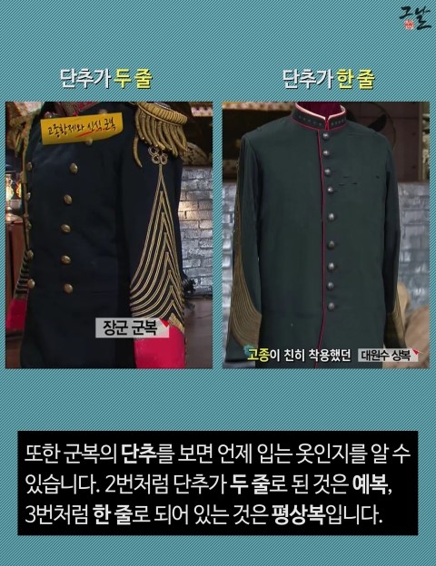 [¿ª»çÀú³Î ±×³¯ Ä«µå´º½º]°íÁ¾ ȲÁ¦´Â ¾î¶² ±ºº¹À» ÀÔ¾úÀ»±î? ¿À´Ã ¼Ò°³ÇÒ ÀÌ ¿ÊµéÀº´ëÇÑÁ¦±¹ ½ÃÀýÀÇ´ëÇ¥ÀûÀÎ ±ºº¹µéÀÔ´Ï´Ù.±×·¸´Ù¸é ÀÌ Áß¿¡¼°íÁ¾ ȲÁ¦°¡ ÀÔ¾ú´ø ±ºº¹Àº¾î´À °ÍÀϱî¿ä? Àß ¸ð¸£½Ã°Ú´Ù¸é,½Å½Ä ±ºº¹À» ÀÔ°í Àִ°íÁ¾È²Á¦ÀÇ »çÁø°úÁ÷Á¢ ºñ±³Çغ¸¼¼¿ä! Á¤´äÀº ¹Ù·Î 3¹øÀÔ´Ï´Ù.´Ù¸¥ ±ºº¹¿¡ ºñÇØ ¾îµò°¡¼Ò¹ÚÇØº¸À̱⵵ ÇÏÁö¸¸,°¡Àå ³ôÀº °è±ÞÀ» ³ªÅ¸³»´ÂÇ¥½ÄÀÌ ¼û¾îÀÖ´Ù´Â »ç½Ç! ÀÚ¼¼È÷ º¸¸é ¿Ê±ê¸¶´Ùº°ÀÌ ±×·ÁÁ® Àִµ¥¿ä.°íÁ¾ÀÌ ÀÔ¾ú´ø ±ºº¹ ¿Ê±ê¿¡¸¸º°ÀÌ 5°³°¡ ÀÖ´Â °ÍÀ» ¾Ë ¼ö ÀÖ½À´Ï´Ù. ¿Ê±ê¿¡ ÀÖ´Â º°ÀÇ °³¼ö´Â°è±ÞÀ» ³ªÅ¸³À´Ï´Ù.À§°ü(¼ÒÀ§, ÁßÀ§, ´ëÀ§)±ÞÀº º°ÀÌ 1°³,¿µ°ü(¼Ò·É, Áß·É, ´ë·É)±ÞÀº 2°³,Àå°ü(À屺)±ÞÀº 3°³, ¿ø¼ö´Â 4°³,´ë¿ø¼ö(ȲÁ¦)´Â 5°³ÀÔ´Ï´Ù. ¼Ò¸Å¿¡ ÀÖ´Â »ç¶÷ ÀÎÀÚ ¸ð¾çÀÇÁÙ(¼öÀå)µµ °è±ÞÀ» »ó¡ÇÕ´Ï´Ù.°è±ÞÀÌ ³ô¾ÆÁú¼ö·ÏÁÙÀÇ °³¼ö°¡ ¸¹¾ÆÁöÁö¿ä. ¶ÇÇÑ ±ºº¹ÀÇ ´ÜÃ߸¦ º¸¸é¾ðÁ¦ ÀÔ´Â ¿ÊÀÎÁö¸¦ ¾Ë ¼ö ÀÖ½À´Ï´Ù.2¹øÃ³·³ ´ÜÃß°¡ µÎ ÁÙ·Î µÈ °ÍÀº ¿¹º¹,3¹øÃ³·³ ÇÑ ÁÙ·Î µÇ¾î ÀÖ´Â °ÍÀºÆò»óº¹ÀÔ´Ï´Ù. 1¹ø ±ºº¹ÀÇ ÇüŰ¡ ´Ù¸¥µÎ ±ºº¹°ú ´Ù¼Ò Â÷À̰¡ ÀÖ´Â ÀÌÀ¯´Â°¡Àå ¸ÕÀú ¸¸µé¾îÁø±ºº¹À̱⠶§¹®ÀÔ´Ï´Ù.ÇÁ·¯½Ã¾È(µ¶ÀÏ)½ºÅ¸ÀÏÀ» °®Ãß°í ÀÖÁÒ. ±ºº¹ ´ÜÃß¿Í ¸ðÀÚ¿¡°øÅëÀûÀ¸·Î ±×·ÁÁ® ÀÖ´Â ÀÌ ²ÉÀº¹Ù·Î Á¶¼±¿ÕÁ¶¸¦ »ó¡Çϴ¿À¾æ²ÉÀÔ´Ï´Ù.ÀÌó·³ ´ëÇÑÁ¦±¹ ½Ã´ëÀÇ ±ºº¹Àº¹®¾ç ÇϳªÇϳª¿¡µµÀǹ̰¡ ´ã°Ü ÀÖ¾ú½À´Ï´Ù. ¾î¶°½Å°¡¿ä?ÀÌÁ¦ ¼¼ ±ºº¹ÀÇ Æ¯Â¡ÀÌÈ®½ÇÇÏ°Ô º¸À̽óª¿ä? ÀÚ¼¼ÇÑ ³»¿ëÀÌ ±Ã±ÝÇϽôٸ鿪»çÀú³Î ±×³¯ 7ȸ<°íÁ¾È²Á¦ÀÇ ºñÀÚ±ÝÀÌ »ç¶óÁø ³¯>À» Âü°íÇϼ¼¿ä! [Ãâó] https://blog.naver.com/musieur89/220834893127